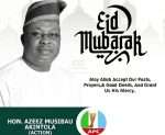 A member of the Oyo State House of Assembly representing Kajola State Constituency, Azeez Musibau Akintola, (Action) has extended warm greetings to Muslim faithful in his constituency on the occasion of Eid-ul-Fitr.